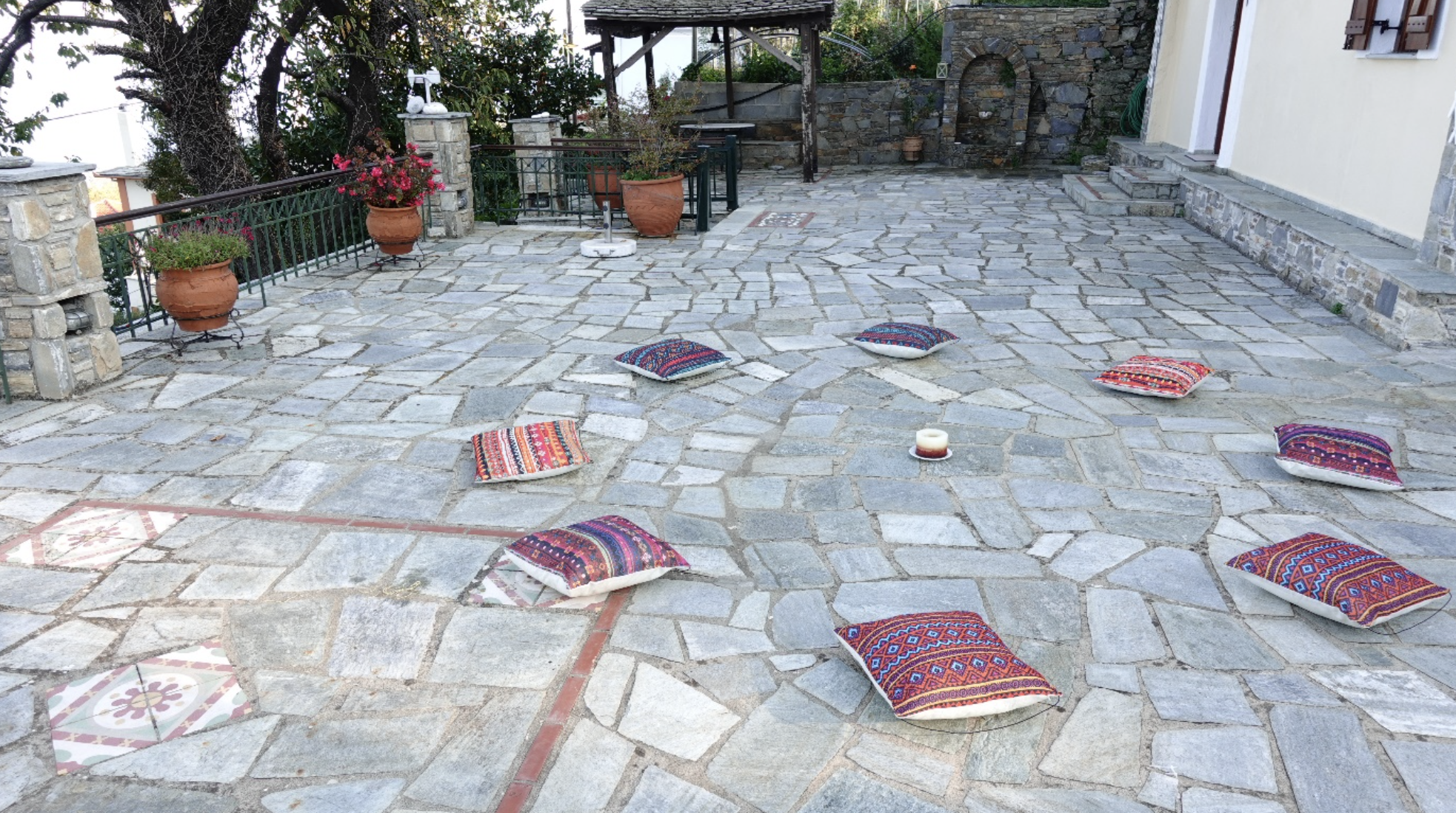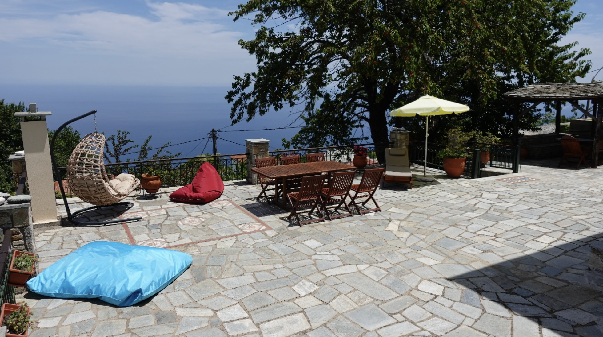Das Großartigste ist der Ausblick auf das Meer aus fast allen Fenstern des Hauses und von allen Terrassenebenen. Aus der Höhe von 510 m betrachtet, ist das Meer wahrlich omnipräsent. Ein Blickwinkel von fast 180 Grad eröffnet sich von Chalkidike bis zu den Sporaden. An klaren Tagen ist der Berg Athos in 110 km Entfernung zu sehen.